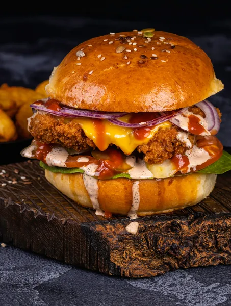 A sandwich that typically consists of boneless, skinless chicken breast served between slices of bread, on a bun, or on a roll.