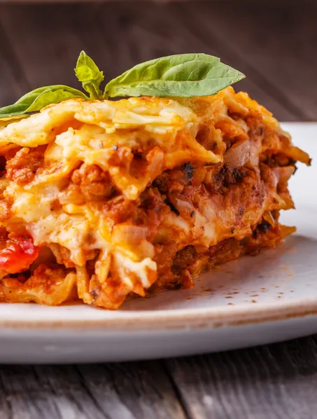 Spaghetti bolognese consists of spaghetti (long strings of pasta) with an Italian ragù (meat sauce) made with minced beef, bacon and tomatoes, served with Parmesan cheese.